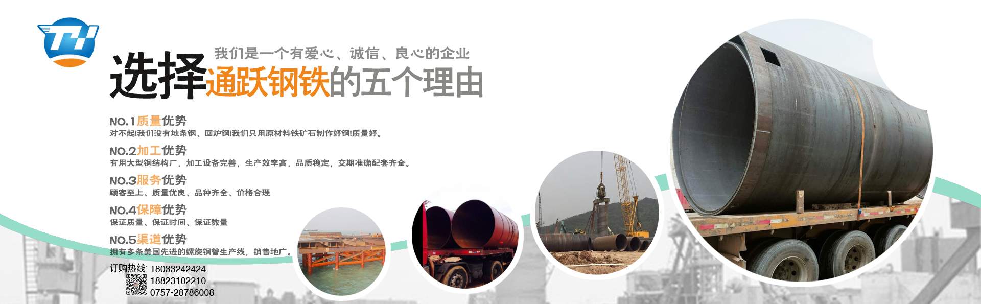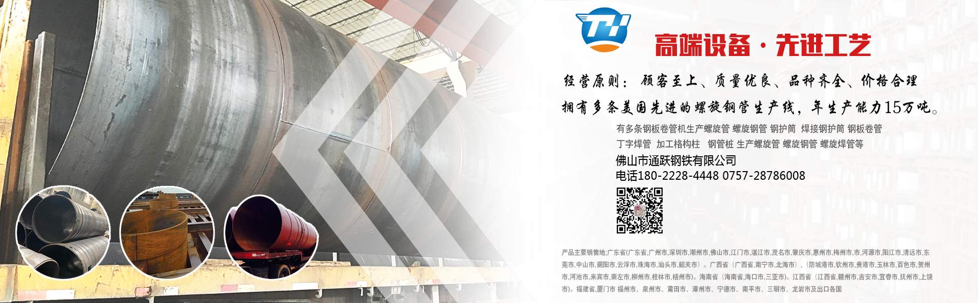 佛山市通躍鋼鐵有限公司 電話180-2228-4448 0757-28786008 擁有多條美國先進(jìn)的螺旋鋼管生產(chǎn)線,生產(chǎn)直徑φ159-φ3620mm(壁厚6mm-20mm)的雙面埋弧螺旋焊鋼管,年生產(chǎn)能力15萬噸。 生產(chǎn)螺旋管 螺旋鋼管 螺旋焊管 規(guī)格厚度6mm-20mm 直徑159mm-3620mm 有多條鋼板卷管機(jī)生產(chǎn)規(guī)格厚度6mm-70mm 直徑400mm-5020mm 螺旋管 螺旋鋼管 鋼護(hù)筒 焊接鋼護(hù)筒 鋼板卷管 丁字焊管 加工格構(gòu)柱 鋼管樁 材質(zhì)Q235B Q345B Q235A 45# 20# Q420D Q390··· ……